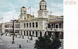In the aftermath of the Spanish–American War, Puerto Rico became a territorial colony of the United States of America.[9] According to the 1899 census of Puerto Rico conducted by the United States War Department, the population of the barrio of San Juan Antiguo (then referred to simply as San Juan Pueblo) was 33,006 inhabitants. With the implementation of new administrative practices during the 20th century, the core urban barrio of each Puerto Rican municipality came to be officially known as Pueblo, which was the case of the name of the barrio used from then on: San Juan Pueblo. In the late 20th century, these Pueblo barrios were officially changed to barrio-pueblo, to explicitly identify them for the context of the 1990 and subsequent US censuses. In the case of the municipality of San Juan where there are multiple urban cores rather than one like in most other Puerto Rican municipalities, instead of renaming the barrio to San Juan barrio-pueblo, the name San Juan Antiguo was used instead. The name of the barrio Pueblo, located in the now district of Río Piedras, serves as a reminder of that barrio's former status as the urban core of the former municipality of Río Piedras before its annexation to the modern city and municipality of San Juan in 1951.[4] San Juan Antiguo, however, continues to serve as the administrative center for the municipality of San Juan with the city hall and numerous other municipal and civic buildings being located in the barrio.[14]