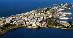 The first documented inhabitants of the area now known as San Juan Antiguo were the indigenous Taino, with evidence of small fishing villages being found in Puerta de Tierra subbarrio during the 19th and 20th centuries.[8] The first European settlement of the barrio began on August 8, 1511, when the settlement of Caparra was abandoned in favor of a new town planned across the bay in the southwestern corner of the Isleta de San Juan. The new settlement was officially founded on August 15, 1521. By the end of the 16th century, the town was the fully-functional administrative center for the Spanish colonization of the rest of Puerto Rico and beyond.[9] The establishment of a well-defended port in the San Juan Bay also established the settlement as a key point for the Spanish military, trade and expansion into the New World.[10]