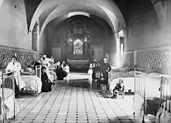 The saint's followers formed the Brothers Hospitallers of Saint John of God, who ran this hospital and maintained from its origin the dedication to healthcare for the most disadvantaged people.[2] In the 19th century the hospital was lost by the Order as a result of the Ecclesiastical confiscations of Mendizábal. Despite this change of status in 1835, the building has always been part of the idiosyncrasy and spirit of the city as a symbol of hospitality. Over time, the Order of San Juan de Dios made numerous attempts to recover what is considered the Order's first hospital, until May 2015 when the Provincial Council of Granada approved a total transfer. It is intended that the premises should continue to be used to provide health care, apart from an area to be used as a museum.[3] [4]