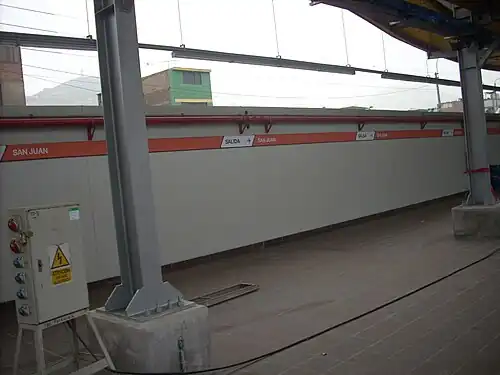 San Juan is a Lima and Callao Metro station on Line 1. The station is located between María Auxiliadora and Atocongo. It was inaugurated on 28 April 1990 as part of the first section of the line between Villa El Salvador and Atocongo. However, commercial service only started on 18 January 2003, was suspended in July 2003 due to the lack of funds, and resumed only on Saturdays and Sundays on 17 January 2004. The full revenue service started on 3 January 2012, with trains running to Miguel Grau.[1][2]