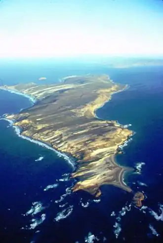 San Miguel Island (Chumash: Tuqan)[1] is the westernmost of California's Channel Islands, located across the Santa Barbara Channel in the Pacific Ocean, within Santa Barbara County, California.[2] San Miguel is the sixth-largest of the eight Channel Islands at 9,325 acres (3,774 ha), including offshore islands and rocks. Prince Island, 700 m (2,300 ft) off the northeastern coast, measures 35 acres (14 ha) in area. The island, at its farthest extent, is 8 miles (13 km) long and 3.7 miles (6.0 km) wide.
