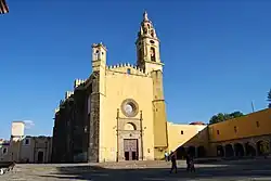 The Franciscan friary is dedicated to the Archangel Gabriel. The complex is surrounded by a wall with pointed merlons which separates it from the main plaza of the city. There are three entrances to the atrium, but the main one is to the west, in front of the main church. The atrium is very large and most of it is in front of the two chapels. A second entrance in the atrium wall leads to this area, which may have been used for evangelization purposes and masses for the indigenous during the very early colonial period. In three corners of the atrium, there are chapels, called "capillas posas", with pinnacle roofs, simple arches which are closed off by railing.[17] The atrium cross was sculpted in 1668. It is identical to that in the atrium of the Nuestra Señora de los Remedios sanctuary.[17] The main church is one of the oldest in Mexico, which the first stone laid in 1549 by Martin de Hojacastro, who would be the third bishop of Puebla.[17] The facade of the main church is smooth and its corners are reinforced with diagonal buttresses. The towers have arched windows, columns and a small dome topped by iron cross. The interior has a Latin cross layout, covered with vaults and a cupola. The altarpieces are made of wood and plaster and decorated in gold leaf. The main one is dedicated to the Virgin of the Remedies. The main portal is sculpted in sandstone in Renaissance style. The main doors are of wood and contain metal studs with different designs. The north portal has richer ornamentation. The interior is covered by vaults with Gothic nerves and arched window openings. It conserves a number of oil paintings from the 17th and 18th centuries. The main altar of San Gabriel is Neoclassical, dating from 1897.[18]