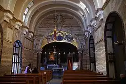 The sanctuary's altarpiece is a fresco which depicts the Virgin Mary with Jesus on her right arm. Tradition attributes this painting to St Luke, but this claim is unsubstantiated. The artwork is believed to actually date back to around the late 12th or early 13th centuries, and its style is inspired from Byzantine art with Sicilian influences and a vernacular quality. It is one of the oldest existing works of art in Malta from the late medieval period. The painting was in a poor state of preservation by 1587, and at that point it was overpainted with a new painting.[10] The depiction of the Virgin Mary is said to be miraculous, and it was crowned by Bishop of Malta Pietro Pace, Bishop of Gozo Giovanni Maria Camilleri and auxiliary bishop Savatore Gaffiero on 24 September 1899, after Pope Leo XIII had issued a decree which allowed this on 29 May 1895.[2] In 1972, restorer Samuel Bugeja removed the 16th century overpainting and revealed the medieval artwork.[11] A copy by Giuseppe Calì of the 16th century version still exists in the sanctuary's sacristy.[10] The fresco was restored once again between 2012 and 2016.[11]