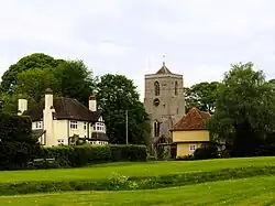 The parish church of All Saints was rebuilt in phases from the mid-14th century. The earliest surviving fabric in the current building is the chancel, which is known to have been rebuilt around 1348; the nave was subsequently rebuilt around the 1360s and the tower and porch were added around 1400. Substantial brick buttresses were added to the tower for support in the 17th century.[6][4]