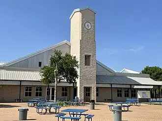 In keeping with a low building scale with respect to the rural surroundings, the campus was designed by Marmon Mok, LLP with a "village concept" and now consists of 15 separate main buildings connected by covered walkways, and 7 buildings for the FFA program. Metal roofs, limestone colored split face CMU, and steel siding were used to follow the German Hill Country vernacular style. The campus features a 990-seat auditorium and an 1800-seat competition gymnasium. The electrical feeders and chilled/hot water piping to the buildings are located above the soffits of canopies connecting each building, avoiding costly trenching. To meet an aggressive construction schedule, pre-engineered steel frames were used for all common buildings while classroom buildings G, H, J, and F use a combination of structural steel and reinforced concrete.[4]