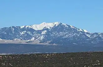 The Spanish Peaks are a pair of mountains, West Spanish Peak, 13,626 ft (4,153 m), and East Spanish Peak, 12,860 ft (3,920 m), located in southwestern Huerfano County, Colorado.[3] The Spanish Peaks were designated a National Natural Landmark in 1976 as one of the best known examples of igneous dikes.[4] The mountains can be seen from as far as 133 mi (214 km) to the north from Colorado Springs, 65 mi (105 km) to the south from Raton, New Mexico, and 85 mi (137 km) to the east from La Junta, Colorado.