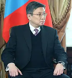 Sanjaagiin Bayar (Mongolian: Санжаагийн Баяр, IPA: [saɲt͡ɕáɣiɴ páɪr̥]; born 24 December 1956) is a Mongolian politician who was General Secretary of the Mongolian People's Party from 22 November 2007 to 8 April 2010, and Prime Minister of Mongolia from 22 November 2007 to 29 October 2009. He announced on 26 October 2009, that he was going to resign his position as prime minister for health reasons.[3] He was replaced by Sükhbaataryn Batbold on 29 October 2009.