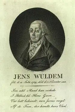 In October 1799, Pahlen sold the property to Jens Wulden. In 1797, Wuldem had returned to Copenhagen after spending most of his life in the Danish colonies. Born in Copenhagen on 18 July 1749, he had come to the Danish Gold Coast at the age of 12. He later continued to the Danish West Indies on board a slave ship. Aged 17, he was appointed as supercargo of a ship to China. He later completed two more journeys to China. He was later sent to Patna by the Danish Asiatic Company. In 1781, he was appointed as 1st Assistant at the Danish factory at Frederiksnagore. In 1774–75, he visited Copenhagen. During his stay in Copenhagen he was married to Anna Giessing with whom he in 1786 returned to Frederiksnagore. His wife died in 1793. In 1792, he succeeded Scavenius as 1st Factor in Frederiksnagore. In 1797, he moved back to Copenhagen. In 1811, he married his housekeeper (née Calussen). He died on 5 November 1813.[3]