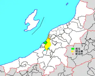 * yellow - areas formerly within the district borders during the early Meiji period