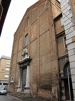 The building was refurbished in 1618 through 1626. In 1797, after the suppression of the order, the church served as cathedral from 1798 to 1809, then it became again the parish church of San Giovanni Evangelista. The reconstruction of the convent, begun in 1787 with designs by Giuseppe Achilli, was never completed. The facade also remains incomplete in brick. On the left of the outer wall of the facade, a marble monument holds the remains of Gian Battista Paci, cavaliere di Santo Stefano, who died in 1615.[1] A 55-meter bell-tower with a pyramidal top is at the rear of the church.[2]