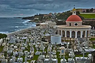 The Santa María Magdalena de Pazzis Cemetery (Spanish: Cementerio Santa María Magdalena de Pazzis) is a colonial-era Catholic cemetery located in Old San Juan, Puerto Rico. It is the final resting place of many of Puerto Rico's most prominent natives and residents. Construction began in 1863 under the auspices of Ignacio Mascaro. The cemetery is located outside the walls of Castillo San Felipe del Morro fortress, one of the island's most famous landmarks. The average height of the wall is 12 metres (39 ft) and the width ranges from 4.6 to 6.1 metres (15 to 20 ft).[1] It was named in honor of Saint Maria Magdalena de Pazzi.