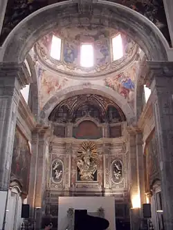 The interior ceiling (1587-1590) was decorated by Giovanni Andrea Magliuolo and painted by Teodoro d'Errico; on the counterfacade is an Epiphany (1728), while the cupola was frescoed by Luca Giordano. In the apse are the remains of the main altar sculpted by the brothers Bartolomeo and Pietro Ghetti; The pavement was designed by Donato Massa. In the chapel, Duke Theodore's remains are housed in a reused ancient Roman sarcophagus.