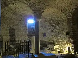 The crypt, belonging to the 10th-century church,[2] is home to Roman architectural elements, such as decorated walls, pavements, capitals from the preceding Roman building, and a sarcophagus with a sculpted cross, dating from the 9th century. From the annexed garden, remains of the ancient city's walls can be seen.