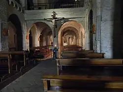 The Romanesque stone church we see today was rebuilt in 1125 by the Lombard abbot Agenolfo or Adenolfo. An earthquake in that era caused the upper portions of the church to collapse. The church once had a lower crypt, above an elevated presbytery and three radial chapels emerging from the apse. The perimeter of the apse had an ambulatory that allowed lay visitors to walk without disturbing the cloistered monks in the central choir space. The interior has a basilica layout with a nave and two aisles. The church has undergone some refurbishments over the centuries. The interior still retains a 15th-century wooden crucifix and medieval frescoes.[1]