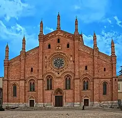 The church has an imposing façade commanding the square with the same name; the slender forms betray a residual Romanesque influence, although the decorations are undoubutably of Lombard Gothic style. The façade is divided into five vertical compartments by six pilasters surmounted by spires. The three central sectors have a portal each, remade by Giuseppe Marchesi in 1854. Over the portals are four large ogival mullioned windows and an elaborated rose window in brickwork.