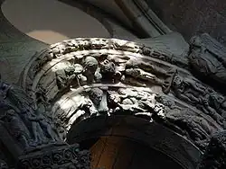 The arch of the right door represents the Last Judgment. The double archivolt is divided into two equal parts by two heads. Some authors identify these heads with the figures of archangel Michael and Christ. For others, they are Christ-Judge and an angel or may indicate God the Father and God the Son. To the right of these heads, Hell is represented with figures of monsters (demons) that drag and torture the souls of the damned. On the left is Heaven with the elect, with figures of angels with children symbolizing the saved souls.[33][34]