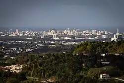 At its population peak in 1950, Santurce had a population of 195,007 inhabitants, making it more populated than every other municipality in the island at the time. This figure together with the annexation of Río Piedras a year after, brought the population of the municipality of San Juan to 451,658 by 1960, making it the second largest city in the Caribbean (after Havana) and the 29th largest city in the United States at the time.[33] The population of the district became the most diversified at the time with large numbers of immigrant communities establishing businesses and institutions in the area. For example, the first synagogue in Puerto Rico, Sha'are Zedeck, was established here during this time in 1952 by William Korber, a wealthy Puerto Rican of German descent.[34] Additionally, a large influx of Jewish Cubans also arrived immediately after the Cuban Revolution in 1959.[35] With the establishment of a more robust island-wide roadway infrastructure, Santurce however began to experience a rapid population decline starting in the 1960s decade as large numbers of residents began to move outward from the city and into the newly emerging suburbs of Bayamón, Carolina, Guaynabo, and Levittown, for example. This period also saw a shift in business and commercialization away from Santurce, which before functioned as one of the main urban cores of the city, towards Hato Rey, and its newly developed central business district that is popularly known as the Golden Mile (la Milla de Oro). By the end of the 20th century, Santurce had a population of only 95,000 inhabitants and, with the exceptions of districts such as Condado, Miramar and Ocean Park, was experiencing extreme urban decay.[36][37]