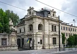 The Sapieha Palace in Lviv, Ukraine is a Chateauesque two-storey mansion dating from the 1870s. It is lightly screened from the road by a wrought-iron grill. The house's first owner was Prince Adam Sapieha, a pioneer of railway building in Galicia.