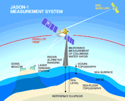 Satellites such as Seasat (1978) and TOPEX/Poseidon (1992-2006) used advanced dual-band radar altimeters to measure the height of the Earth's surface (sea, ice, and terrestrial surfaces) from a spacecraft. Jason-1 began in 2001, Jason-2 in 2008 and Jason-3 in January 2016. That measurement, coupled with orbital elements (possibly augmented by GPS), enables determination of the terrain. The two different wavelengths of radio waves used permit the altimeter to automatically correct for varying delays in the ionosphere.
