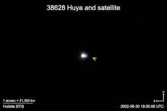 ![]() Huya and its satellite (indicated with arrow) imaged by the Hubble Space Telescope in 2002 | |