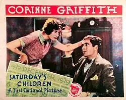 Saturday's Children is a 1929 American sound part-talkie romantic-comedy film directed by Gregory La Cava, and starring Corinne Griffith, Grant Withers, Albert Conti, Alma Tell, Lucien Littlefield. In addition to sequences with audible dialogue or talking sequences, the film features a synchronized musical score and sound effects along with English intertitles. According to the film review in Variety, 60 percent of the total running time featured dialogue. [1] The sound was recorded via the Vitaphone sound-on-disc process. The film was released by Warner Bros. on April 14, 1929.[2][3][4] The film is based on the 1927 play Saturday's Children by Maxwell Anderson.