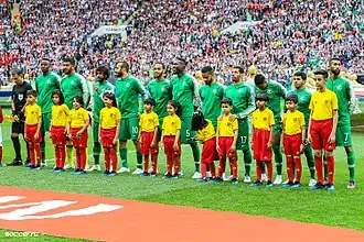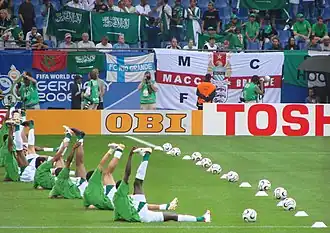 Traditionally, Saudi Arabia's home kit is white with a green trim, and the away kit is green with a white trim (the Saudi flag colors).[37] In 2023, the team switched their colors, with green as the home color and white is away.