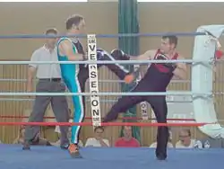 Savate (French pronunciation: [savat]), also known as French Boxing (French: Boxe Française) or French Foot Fighting, is a French hybrid martial art and full-contact combat sport that combines principles of western boxing with a wide variety of kicking techniques.[5][6][7][8] Unlike kickboxing which allow knee and/or shin strikes in competitive bouts, savate involves kicking exclusively with one's feet, but participants can nonetheless target any part of the body. The sport is also notable for requiring footwear to be worn by the competitors, as would be expected from individuals fighting in the streets. A male practitioner of savate is called a "tireur" while a female one is a "tireuse".[9]