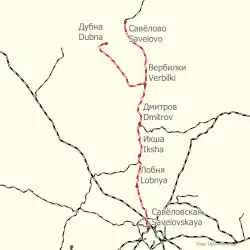 The suburban railway line follows the railway which connects Moscow with Rybinsk and Vesyegonsk. It is electrified between Moscow and Savyolovo. Between Moscow and Dmitrov, there are two tracks, north of Dmitrov there is one track.[2] The distance between Savyolovsky railway station and Savyolovo is 129 kilometres (80 mi).