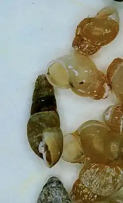 Sayella fusca found in Wellfleet, MA, with multiple minute hydrobia shells surrounding it | |
