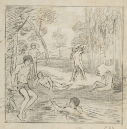 The work is the result of long and arduous planning by Bazille, as demonstrated by the numerous sketches and drawings that depict Bazille's original plans for the painting. In addition to the many rough sketches, Bazille created his only known drawing of an entire composition. Rather than the eight figures depicted in Scène d'été, the compositional drawing consists only of seven, with four of them—the young man reclining, the figure in the front-left, and the two wrestlers in the background—placed in the same location as in the final painting.[5] Additionally, the wrestling figures in the center of the canvas are locked together more rigorously in the painting than in the drawing, while the boy in the water below is more-or-less floating with his head briefly turned to the left, unlike in the drawing, where the boy adopts a more natural swimming pose.[6] The sketches found in Bazille's sketchbook depict variations of the figures found in the drawing and final painting, demonstrating how Bazille meticulously planned the poses of each figure. The two wrestling figures are drawn multiple times in various interlocking grips, and another of these sketches shows a seated figure with his back turned to the spectator, likely revealing another figure Bazille refrained from including in the final work.[5]