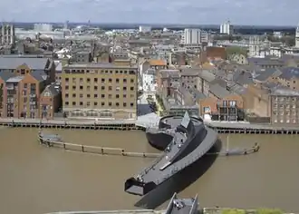 Planning for the black steel Scale Lane Footbridge began in 2005, and McDowell+Benedetti won a competition.[1][2] Alan Baxter Ltd was hired as the structural engineer on the project.[3] The bridge officially opened on 28 June 2013.[4] The bridge spans the harbour between Hull's Old Town and an industrial section of the city,[1] and was intended to connect the town centre to a planned housing development.[5] It crosses the old harbour which is connected to the River Humber.[6]