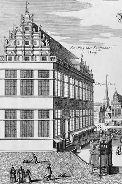 In 1547, the merchants of Bremen charged the Flemish mason and architect Johann den Buschener from Antwerp, who constructed a new building in 1538/39. Due to financial limits, the fine design of the façades lasted much longer. Buschener only completed the stepped western gable, which is on the borderline of Late Gothic and of Renaissance style, and the main entrance, which was not yet central. The eastern gable, pure Renaissance, was crafted in 1565 by a local mason named Karsten Husmann. In 1594, the cornice overlooking the market square was enhanced by a magnificent maritime gable. Lüder von Bentheim, the architect of the Renaissance refresher of the townhall, was engaged in it, too.