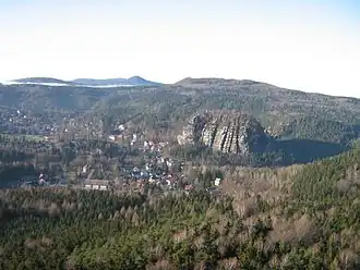 The Scharfenstein (English: Sharp Stone; Upper Sorbian: Wótry kamjeń) is a rock and about 25 metres high, situated in the Lusatian Mountains. It sits on a mountain with an elevation of 569 metres in the German southeastern state of Saxony. Due to its distinctive shape it is also called the "Upper-Lusatian Matterhorn" by the locals. The rock can be accessed via ladders and a staircase from the south and is one of the most famous look-outs in the Zittau Mountains.