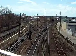 The railways formerly branched in both directions from Germersheim station, but the lines now only branch to the south. It is at the extreme northern end of the city and its track layout is partly in the municipality of Lingenfeld. The original entrance building, which is to the east of the railway tracks, is also under heritage protection.[16] It was opened as a terminal station in 1864. With the commissioning of the Germersheim–Landau railway in 1872, trains had to reverse in the terminus to continue along the other line. This situation did not change until the Schifferstadt–Germersheim line was completed to Wörth to the south in 1876. A year later the Bruhrain Railway from Bruchsal to Rheinsheim was extended to Germersheim. Thus, it became an important junction station for long-distance traffic in the east–west direction and from 1906 also in the north–south direction. When Alsace-Lorraine returned to France after the First World War, it lost importance for north–south traffic. It has been part of the Rhine-Neckar S-Bahn since 2006 and integrated into the network of the Karlsruhe Stadtbahn since 2010. In this context, its platforms have been adapted for the disabled.