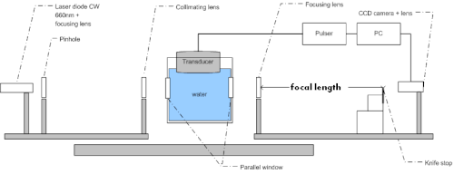 The accepted gold-standard for quantitative acoustic measurement is the hydrophone. However, scanning the acoustic field with a hydrophone suffers from several limitations, giving rise to supplementary evaluation methods such as the schlieren imaging. The importance of the schlieren imaging technique is prominent in High Intensity Focused Ultrasound (HIFU) research and development. [5] Advantages of schlieren imaging include: