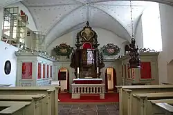 The church was originally furnished in the Renaissance style and still contains a pulpit altar and a baptism from the middle of the 17th century, both works by Claus Gabriel. Under Duke Philipp Ernst, the chapel was furnished in a baroque style around 1717, and in 1847 it received a Marcussen organ . During restoration work in 1973, frescos from the time the castle was built were uncovered. To the west of the chapel is the house crypt in which the last burial took place in 1811 and in which 38 members of the ducal family are buried. In the castle chapel is a smoke barrel from the 13th century, the last known artifact from the destroyed monastery church.