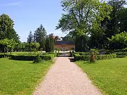 Already during the time of the Rüdekloster, the monastery had a garden, which was lost after the grounds were laid down and the castle pond was dammed. With the exception of a kitchen garden from 1622, the palace was only given a larger park area in the 18th century. Under the gardener Jürgen Lorentzen, a small pleasure garden was laid out on the site of the later rose garden from 1706 to 1709. Since Glücksburg is surrounded by water on three sides and the outer bailey is in front of the fourth side, the larger park was placed behind the outer bailey from 1733 without direct reference to the castle. This baroque garden essentially consisted of a large parterre, which was aligned with an orangery building erected in 1743.[23]