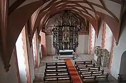 Small round stairway towers are located in the four corners of the court. The Schlosskirche or chapel is in the north wing. It extends through the ground and upper floor, with a rib vault referencing Gothic style. The chapel's altar, made from alabaster and marble, is by Hans Juncker. It features a statue of Johann Schweikhard von Kronberg, holding a model of the castle.[2]: 74