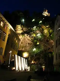 The Schlossberg funicular (Schloßbergbahn) carries passengers from the western foot of the hill up to the restaurant near the top, while a pair of elevators lead up to another restaurant overlooking the clocktower. At ground level, the lift is reached via a short tunnel from Schloßbergplatz on the western side of the hill.[8][9]