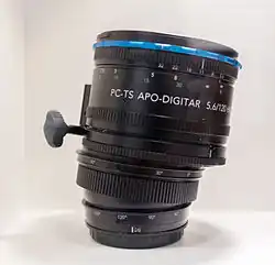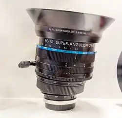 A 28 mm f/2.8 shift lens with 67EW filter thread and a lens shade with filter holder for 74R rimless filters and M92x1.00 filter ring. Many user-changeable mechanically-only mount modules available from Schneider Kreuznach. Also available as Leica PC-Super-Angulon R 28 mm f/2.8 with Leica R mount. Can be modified from a shift-only lens to a tilt-only lens by the German company.