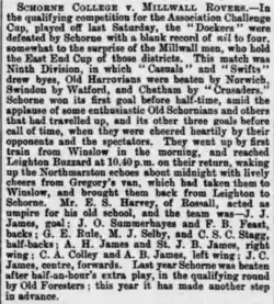 The club's best win in competitive football came in the 1889–90 FA Cup qualifying rounds, by beating Millwall Athletic 4–0, away from home.[8] The second round tie with Watford Rovers was played at the Vale of Aylesbury Cricket Ground, and the Schornians were doubly unlucky - one player had already been claimed by Swifts, and another got on the train to Oxford by mistake, and only turned up at Aylesbury when the match was over.[9] Even so, the Schornians, 7 of whom were pupils at the college, were 1–0 ahead at the break thanks to a goal from J. J. James, but the side suffered even more bad luck, as the wind picked up in the second half when it was to the Rovers' backs, and the Watford side scored twice in the last quarter of an hour to go through.[10]