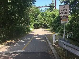 The trail continues southeastward, unpaved, along the former Manayunk Canal Towpath[10] of the Schuylkill Navigation System, passing through the neighborhood of Manayunk to the end of the towpath at Lock Street. Trail traffic is then directed onto the street or sidewalks of Main Street and Ridge Avenue toward Fairmount Park, where the trail meets the southern end of the Wissahickon Trail. Trail traffic continues on the road or sidewalk over the historic Ridge Avenue Bridge (NRHP) crossing the Wissahickon Creek, and turning right onto the paved multi-use trail beside Kelly Drive through east Fairmount Park.