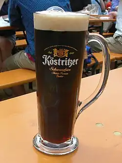 Schwarzbier (German: [ˈʃvaʁt͡sˌbiːɐ̯] lit. ⓘ 'black beer') is a dark lager that originated in Germany.[1] It has an opaque, black colour with hints of chocolate or coffee flavours, and is generally around 5% ABV.[2] It is similar to stout in that it is made from roasted malt, which gives it its dark colour.[2]