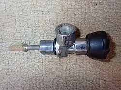 A scuba cylinder valve or pillar valve is a high pressure manually operated screw-down shut off valve fitted to the neck of a scuba cylinder to control breathing gas flow to and from the pressure vessel and to provide a connection with the scuba regulator or filling whip.[1] Cylinder valves are usually machined from brass and finished with a protective and decorative layer of chrome plating.[2] A metal or plastic dip tube or valve snorkel screwed into the bottom of the valve extends into the cylinder to reduce the risk of liquid or particulate contaminants in the cylinder getting into the gas passages when the cylinder is inverted, and blocking or jamming the regulator.[3][4]