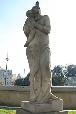 Motherhood | Vicenç Navarro | Stone | 2,73 x 0,92 x 1 | It is one of the figures located on the upper terrace, of those that originally were to be in the pavilion designed by Nebot for the square. When this project was cancelled, it was left as a free-standing sculpture, located on a pedestal and facing the mountain side of the square. It is an allegory of motherhood, represented by a woman with a naked torso and a tunic that covers her from the waist down, holding a child in her arms. This theme was fashionable at the time, generally related to conservatism, not in vain it was an official commission from institutions that emanated from the dictatorship of Primo de Rivera. Navarro made two other works for the square, Woman with Angel and The Night, although the latter was finally installed in the Parc de la Ciutadella.[19] | |