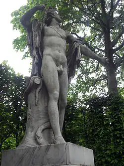 31 | Amphion | Joseph Baptist Hagenauer | Amphion was the son of Zeus by Antiope.[38] After she was raped by Zeus, Antiope fled to Sicyon and married King Epopeus. She was later captured by Nycteus or Lycus and taken back to Thebes. Along the way she gave birth to the twins and was forced to leave them on Mount Cithaeron. After being enslaved by Lycus and his wife Dirce, who treated her cruelly for many years, Antiope escaped and eventually found her sons, who avenged her captivity by killing Dirce—tying her to the horns of a bull.[39] Amphion and Zethus went on to conquer Thebes, where they ruled together. Amphion became a great singer and musician after Hermes taught him to play and gave him a golden lyre. He and his brother built the walls around the Cadmea, the citadel of Thebes. Amphion's musical skill was so great that when played his lyre, the stones simply moved into place.[39] | ![]() |