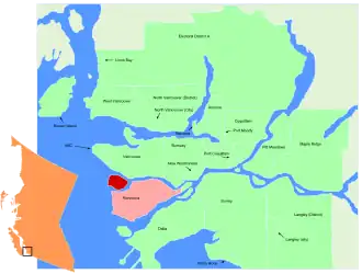 ![]() Sea Island (in red) within the rest of Richmond (pink, which occupies much of Lulu Island) and Metro Vancouver (green) | |