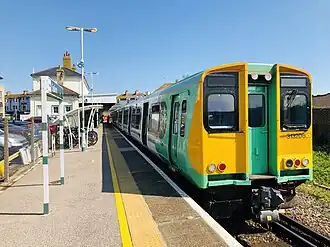 Seaford railway station is in Seaford, East Sussex, England. It is the terminus of the Seaford branch line of the East Coastway line, 58 miles 77 chains (94.9 km) measured from London Bridge.[1] The line to the station has been reduced to a single track and only one platform remains in use (previously two), though it is still numbered platform 2. Platform 1 is still visible but the track has been removed.