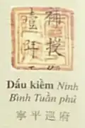 It was stipulated in the year Minh Mạng 13 (1832) that the Kiềm ký-type seal was granted to the government offices of các tấn, thủ, vịnh, sở, the guards of the Meridian Gate (thủ hộ Ngọ Môn), the guards of the Great Palace (thủ hộ cửa Đại cung), the departments of the Six Provinces of Southern Vietnam (sở Tuần ty 6 (lục) tỉnh Nam Kỳ), and Trấn Tây Thành (thành Trấn Tây, Cambodia under Nguyễn dynasty rule).[13]