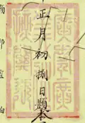 It wasn't until the year Minh Mạng (1822) that rules were laid out for how, when, and where seals had to be used on official documents.[8] Modern scholarship based on the books "Khâm định Đại Nam hội điển sự lệ" and "Minh Mệnh chính yếu" concluded that the first stamps of a document were reserved for the Thủ tín thiên hạ văn vũ quyền hành, Quốc gia tín bảo, Văn lý mật sát, Ngự tiền chi bảo.[8] These imperial seals were all cast in either gold or silver and were considered to be national treasures.[8] Gold seals were often prominently placed on the era dates to signify the importance of the Emperor and the official nature of the document.[8] The Văn lý mật sát seal was used to enclose important words, corrections, and revisions of different versions, threads, chapters, and books.[8] The role of this precaution was to re-verify the corrections, fixes, additions, and to avoid unlawful fabrication.[8] Separate rules also existed for when a seal was allowed to be stamped with either red ink or black ink.[13]